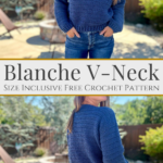 Sometimes you just need a simple, no frills, easy crocheted sweater. The Blanche V-Neck sweater ticks all of those boxes! Available in NINE sizes from XS through 5XL, this is a free crochet pattern that is beginner friendly. Let’s make one!