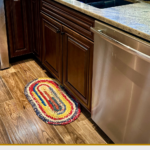 This rag rug pattern is made in an oval shape. The finished dimensions of this particular rug pictured is 16″ x 28″, so perfect to put in front of the kitchen sink or in the bathroom. You could easily make it larger by continuing to add rows, increasing every other row as outlined at the end of the pattern.
